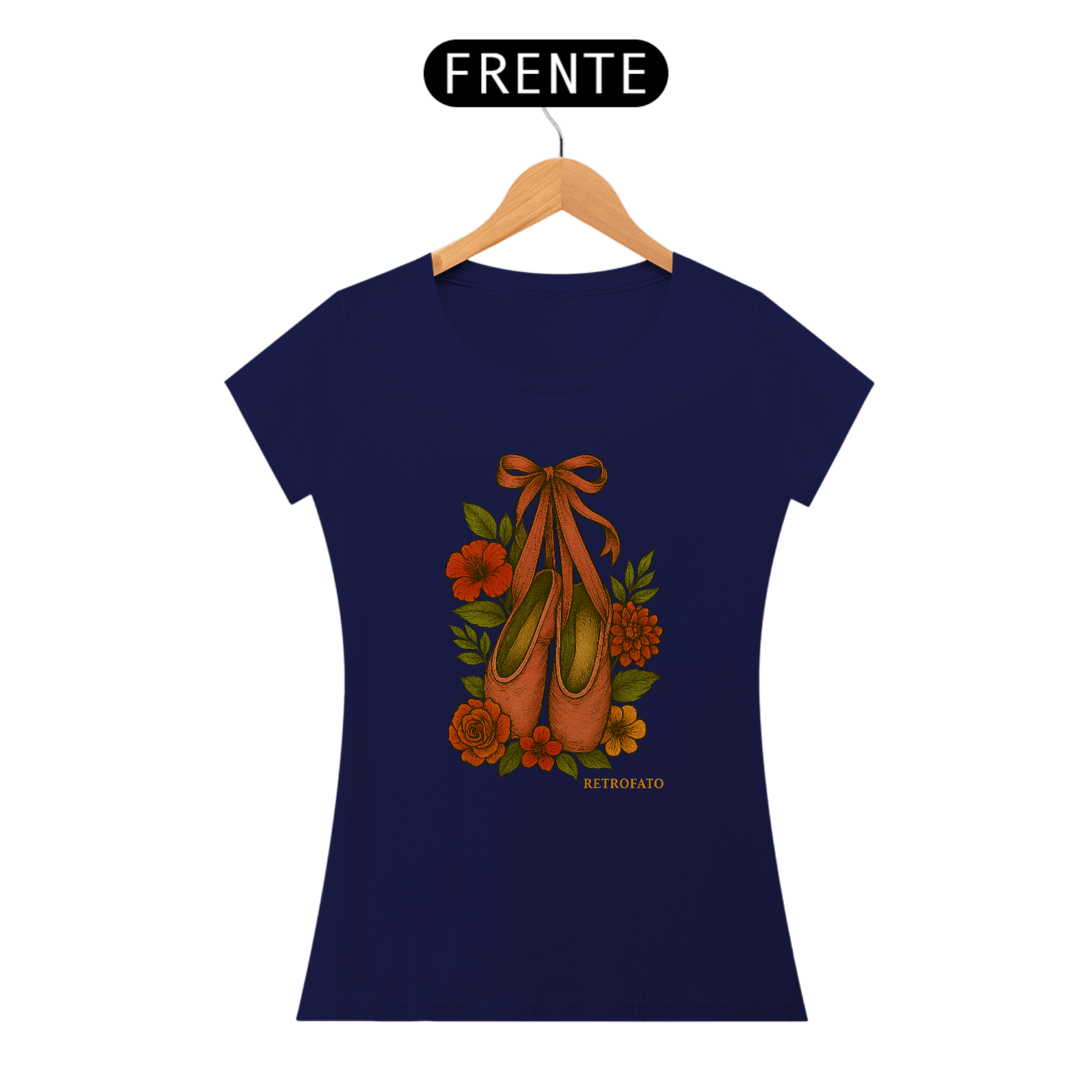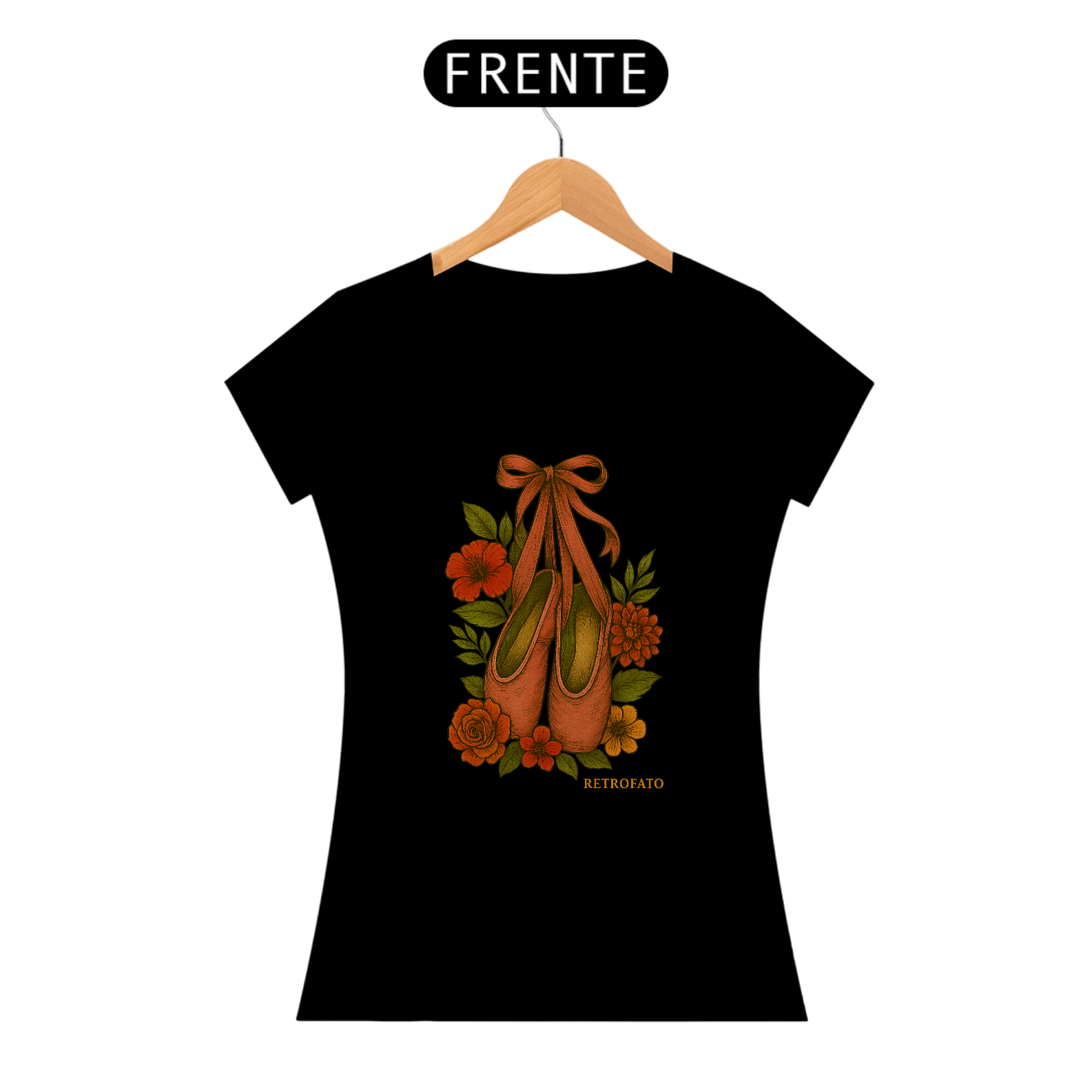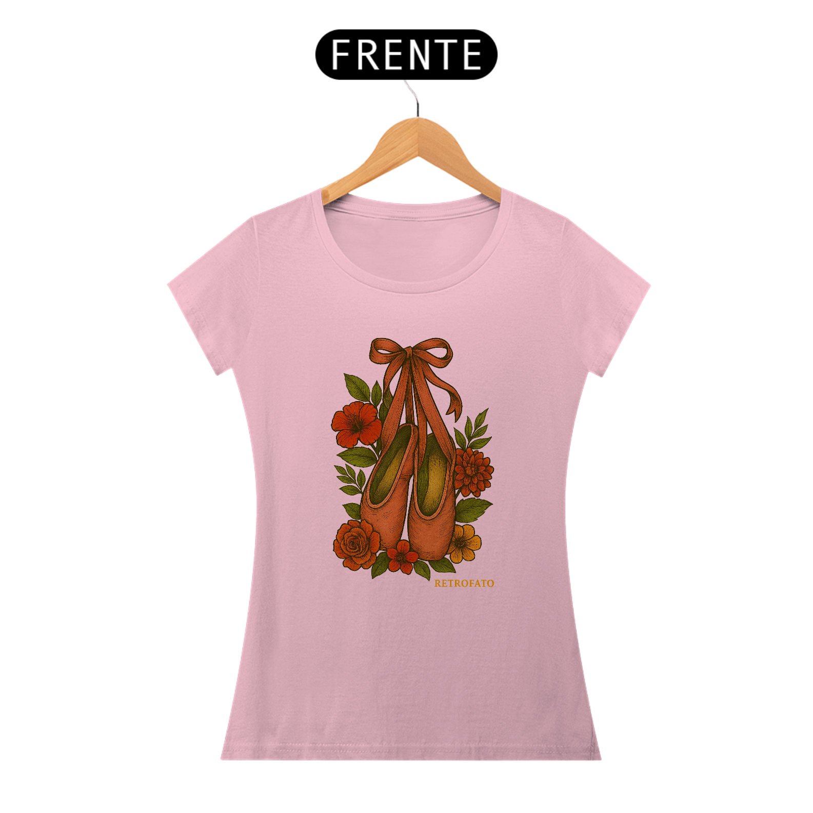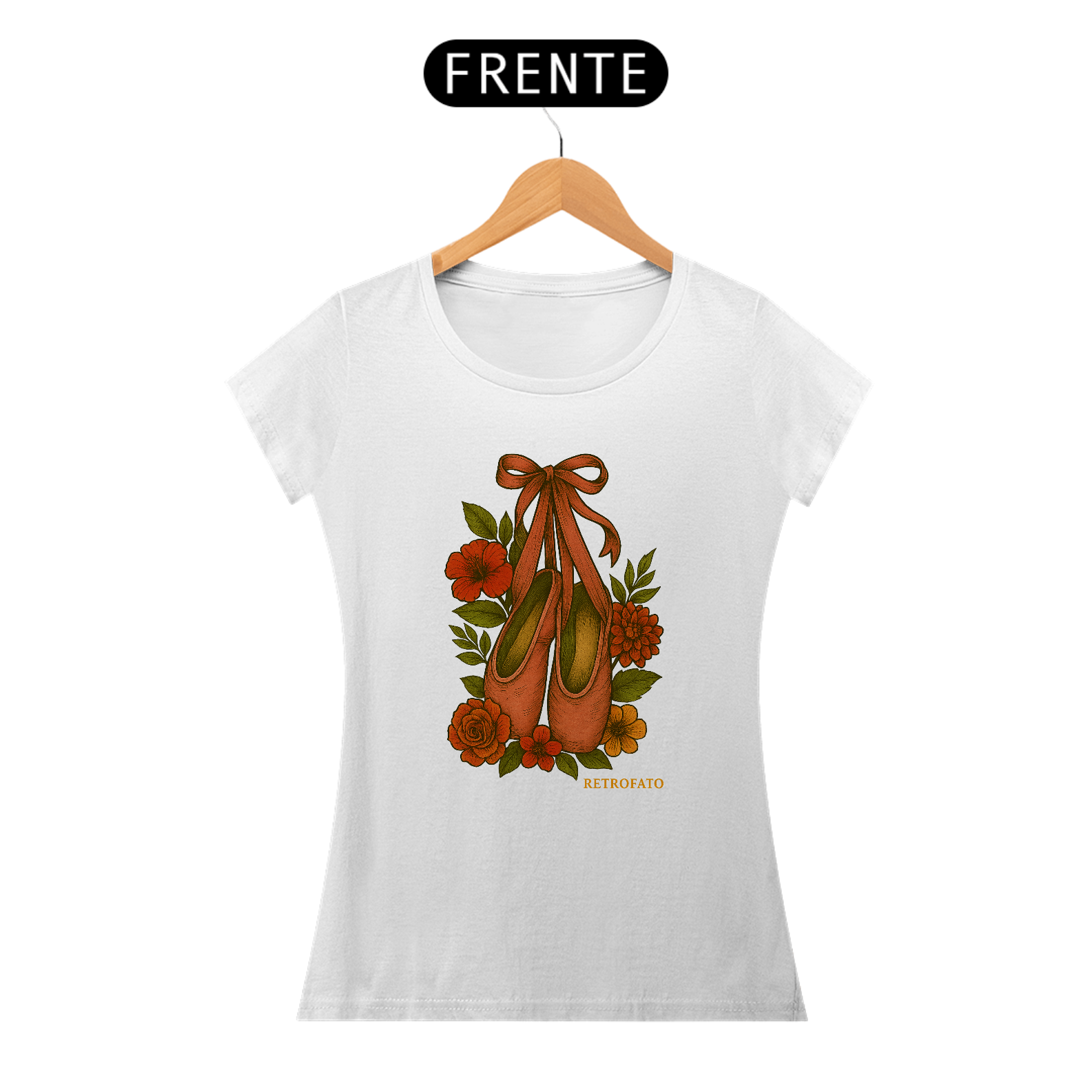 A camiseta "Sapatilha RetroFato" homenageia a beleza e a disciplina da dança clássica, trazendo a representação realista de sapatilhas de ponta sobrepostas, envolvidas por flores vibrantes.
