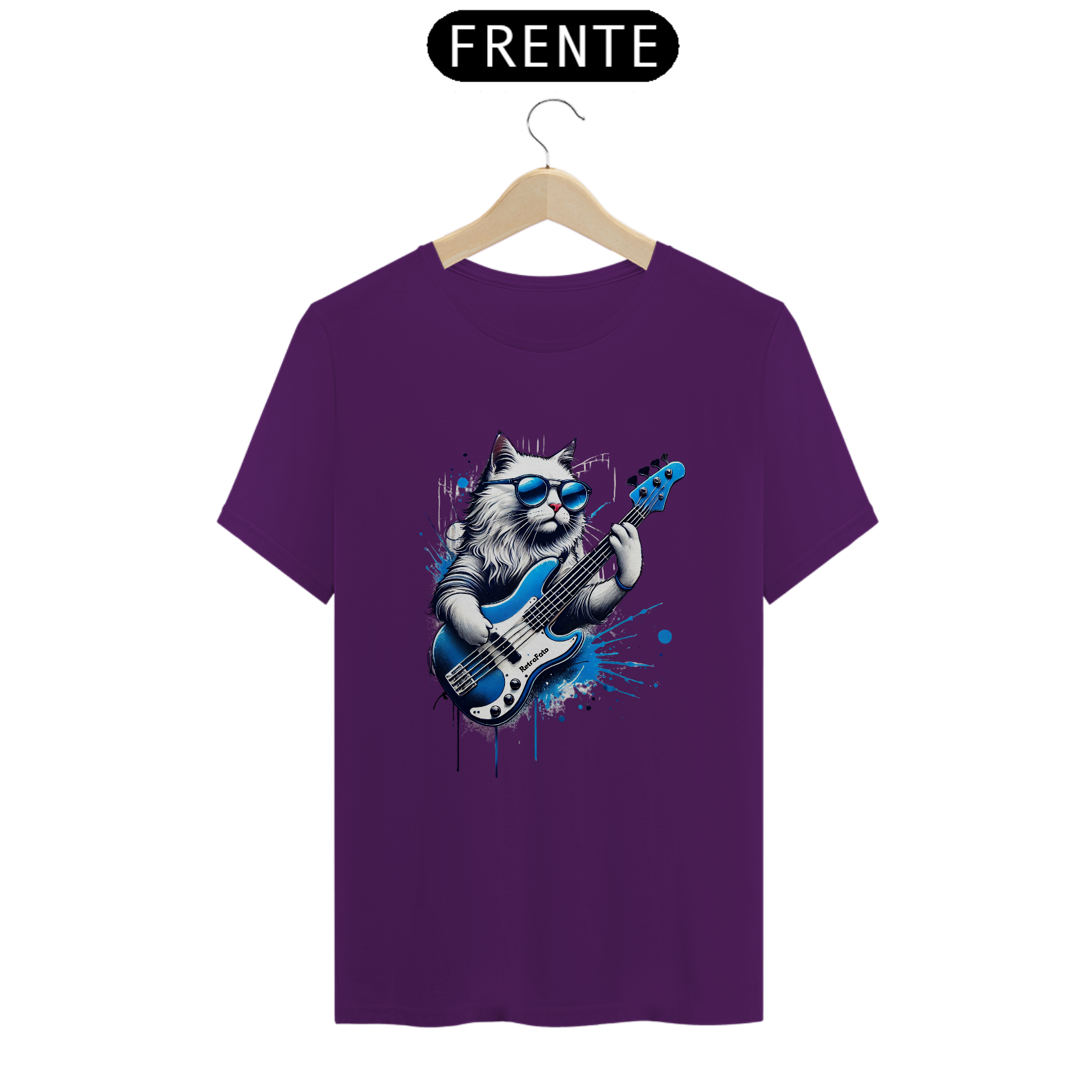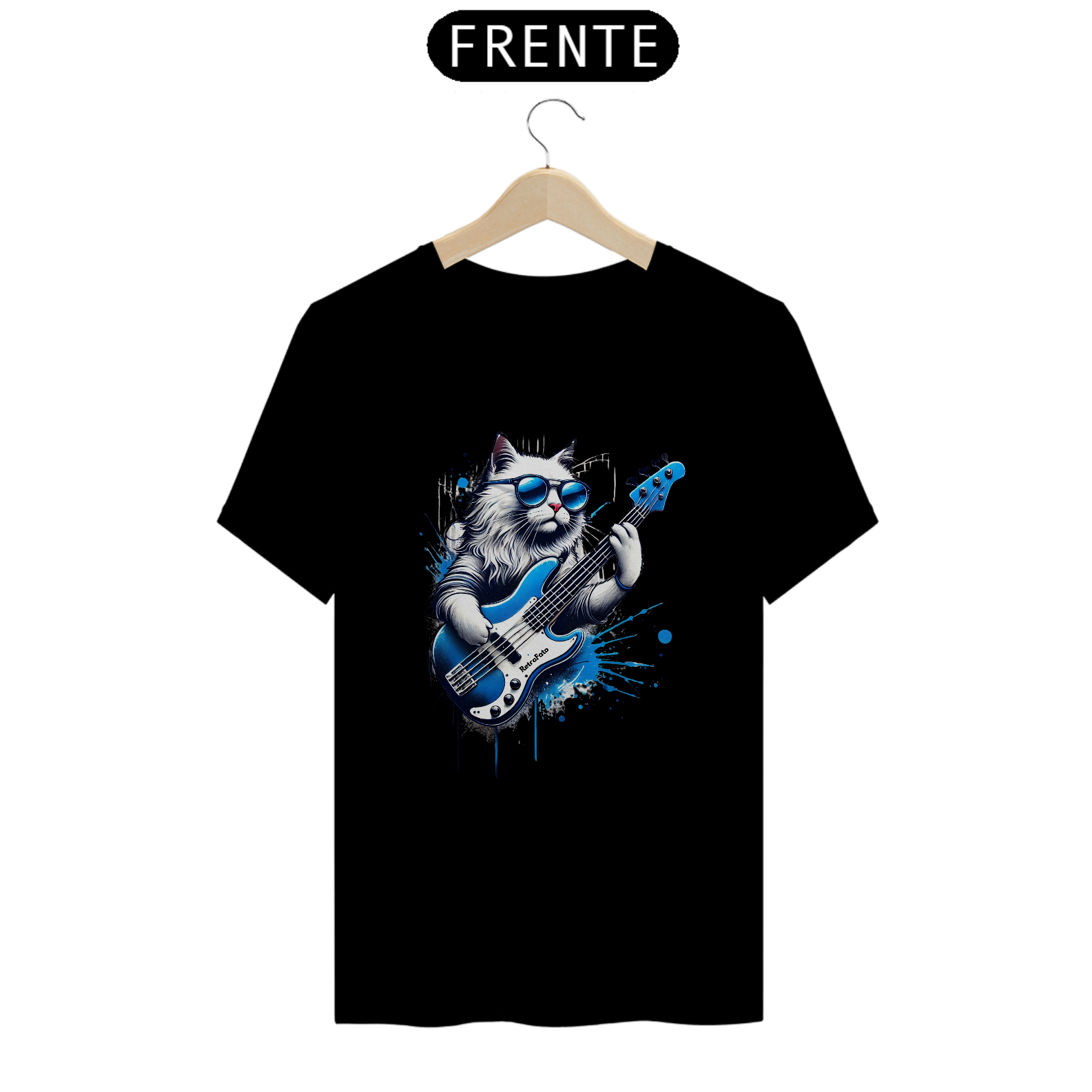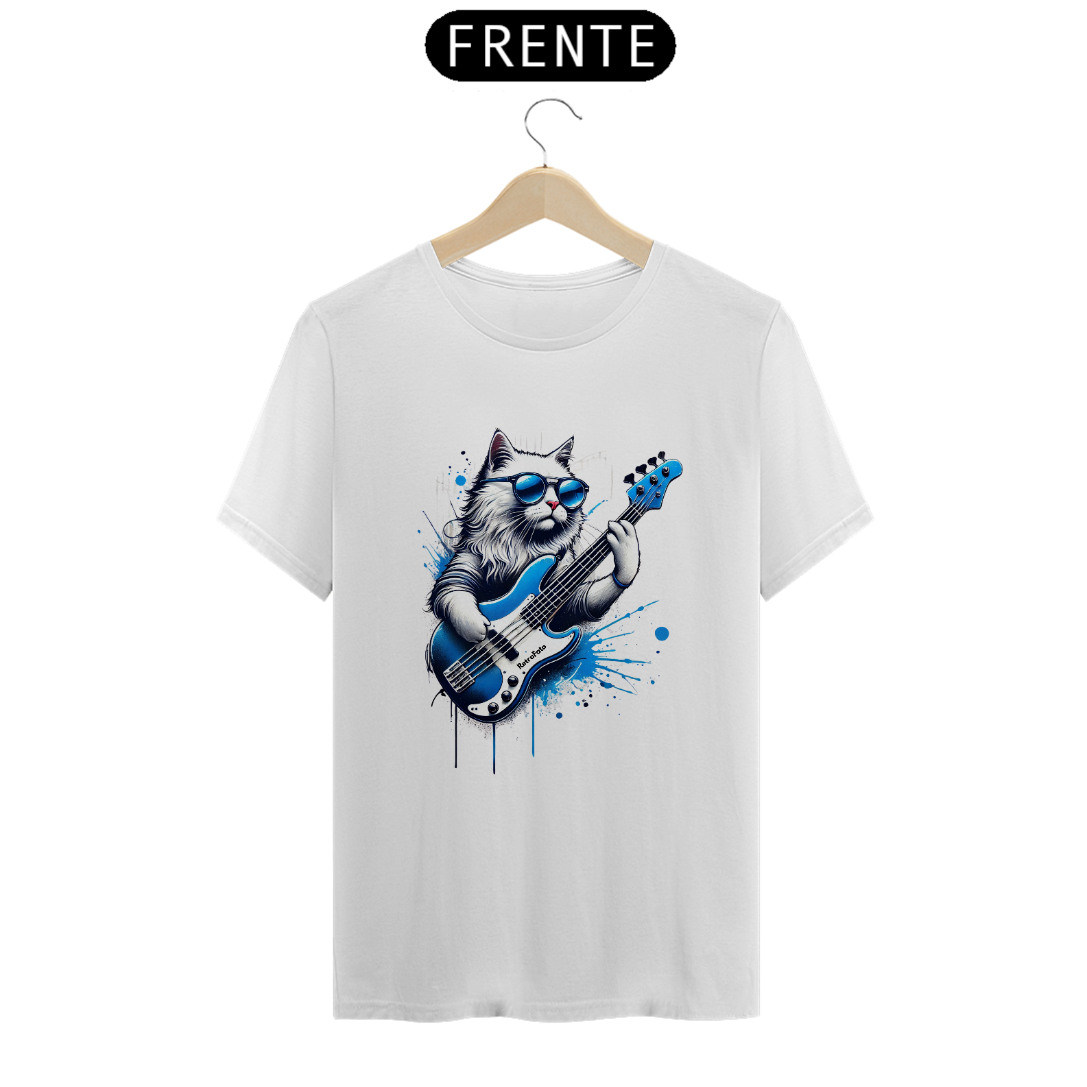 A camiseta Gato Baixista da RetroFato é feita para quem vive no ritmo do groove. Um gato de pelagem clara, óculos azuis espelhados e um baixo elétrico vibrante dão vida a essa estampa poderosa, com splash artístico que transmite energia, irreverência e muito estilo.