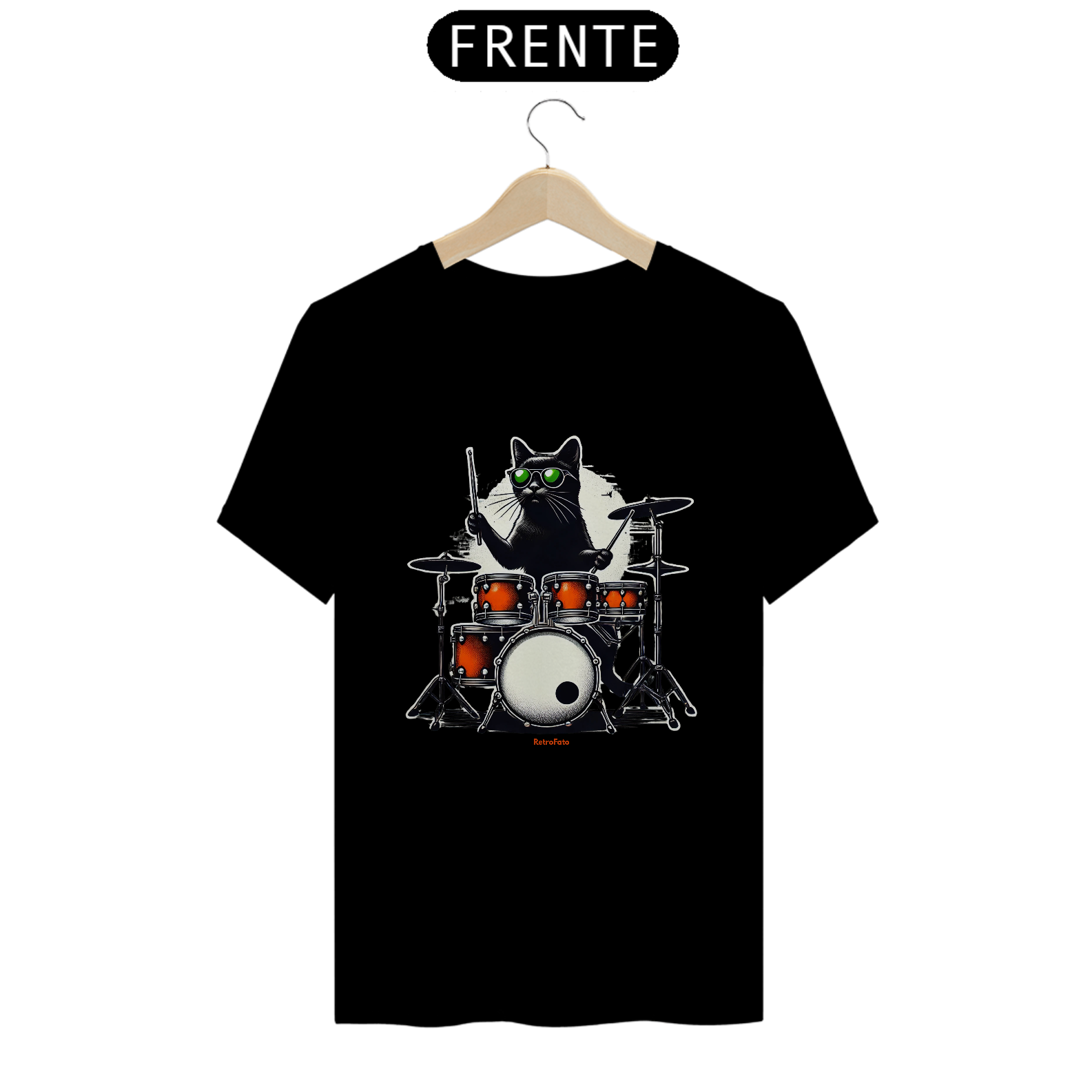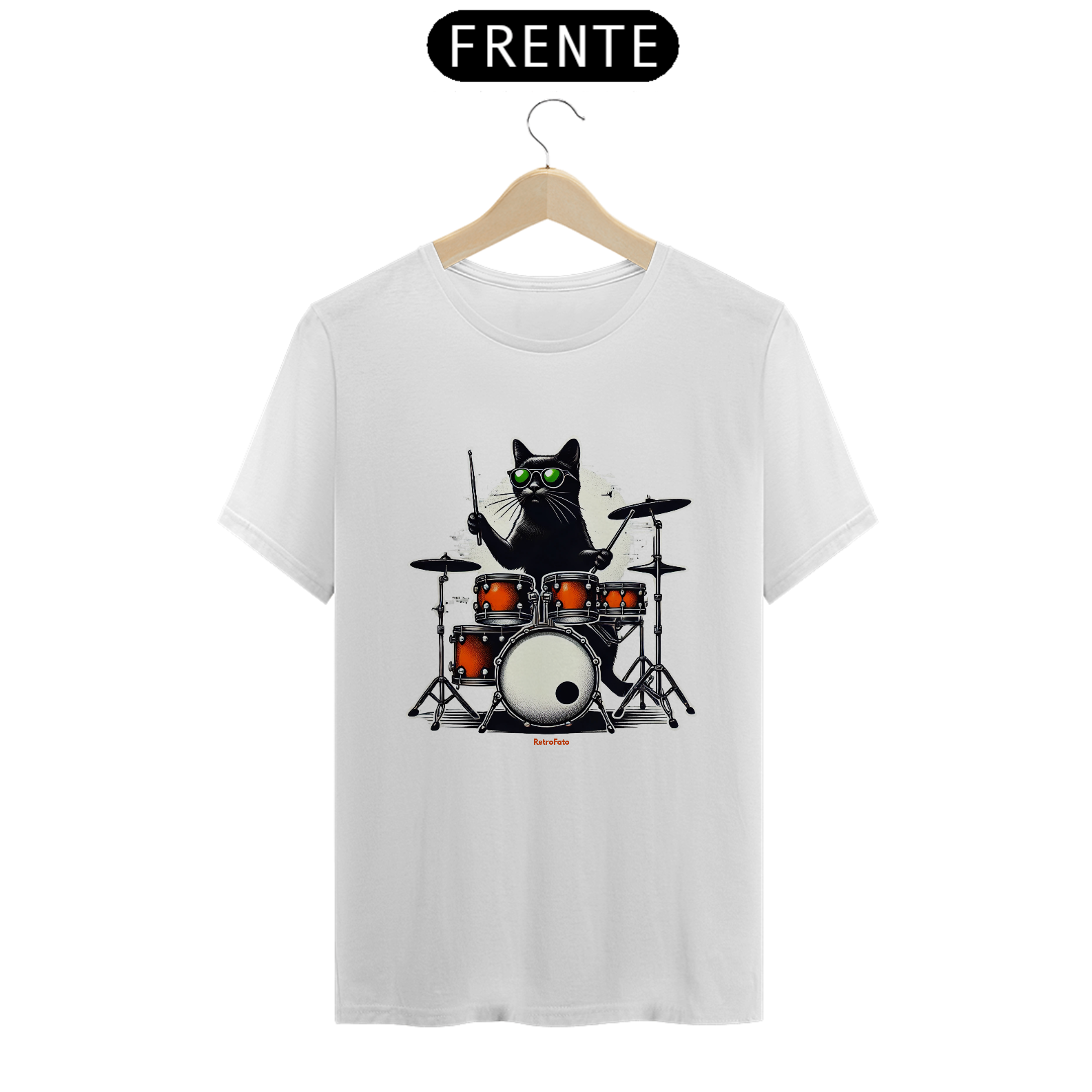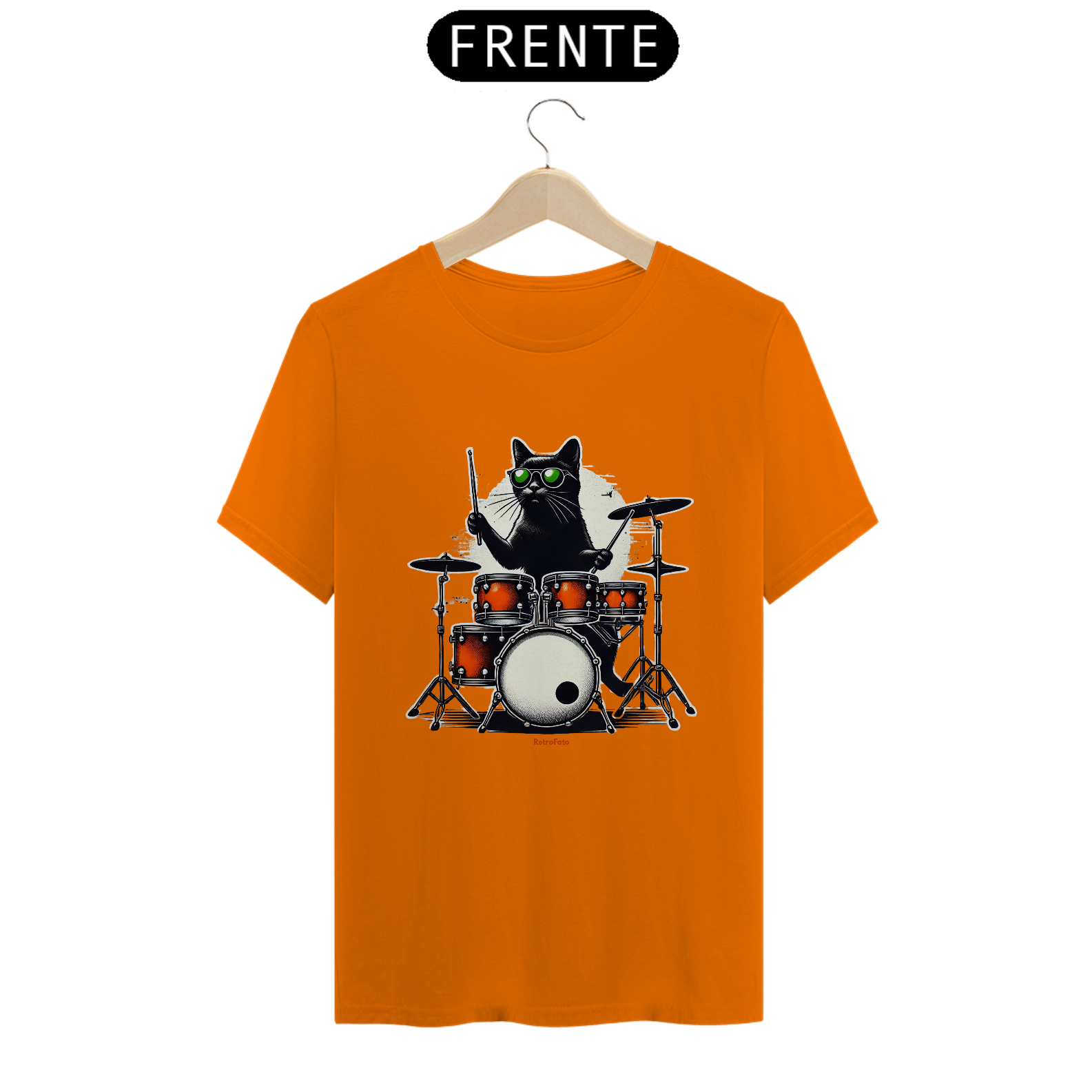 Essa camiseta da RetroFato traz um gato preto elegante, usando óculos verdes e comandando uma bateria vibrante em tons alaranjados. Uma cena que mistura irreverência, musicalidade e impacto visual — tudo com aquela estética retrô moderna que só a RetroFato entrega.