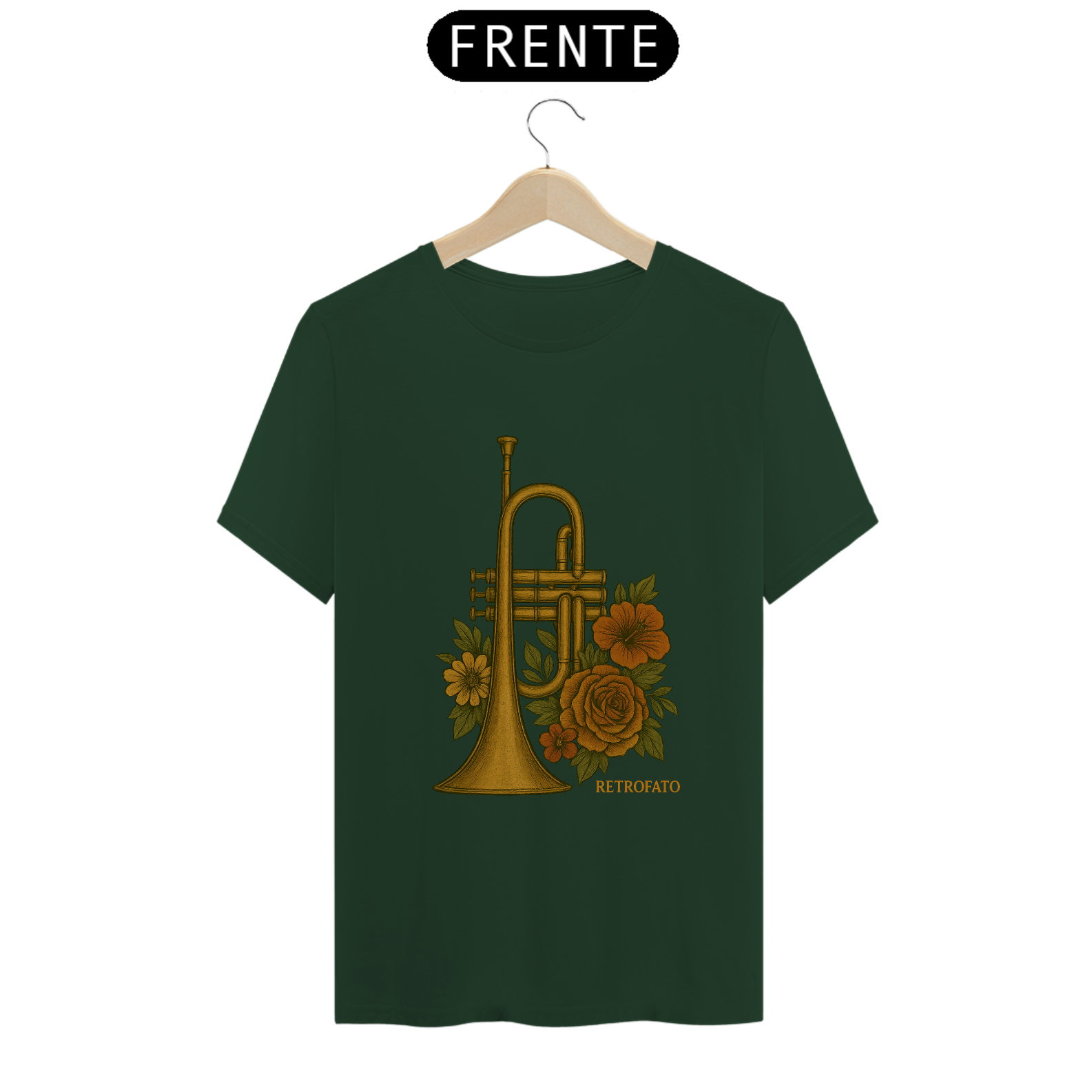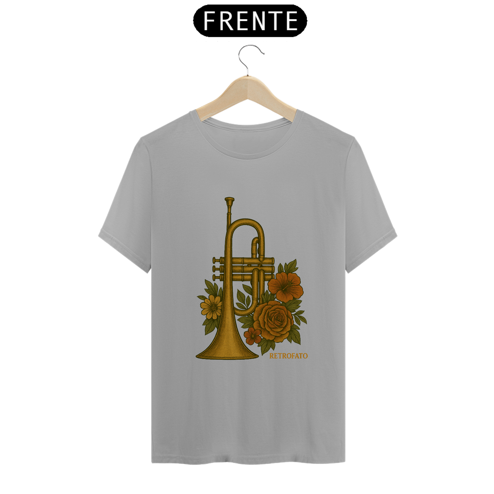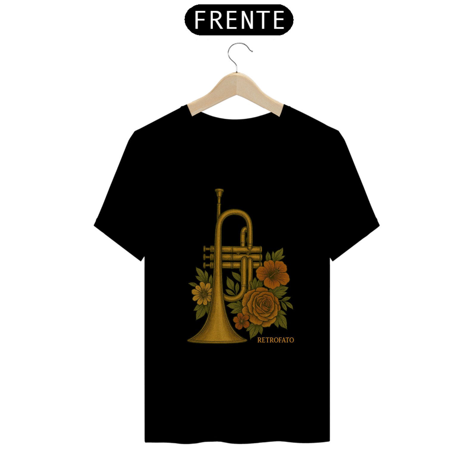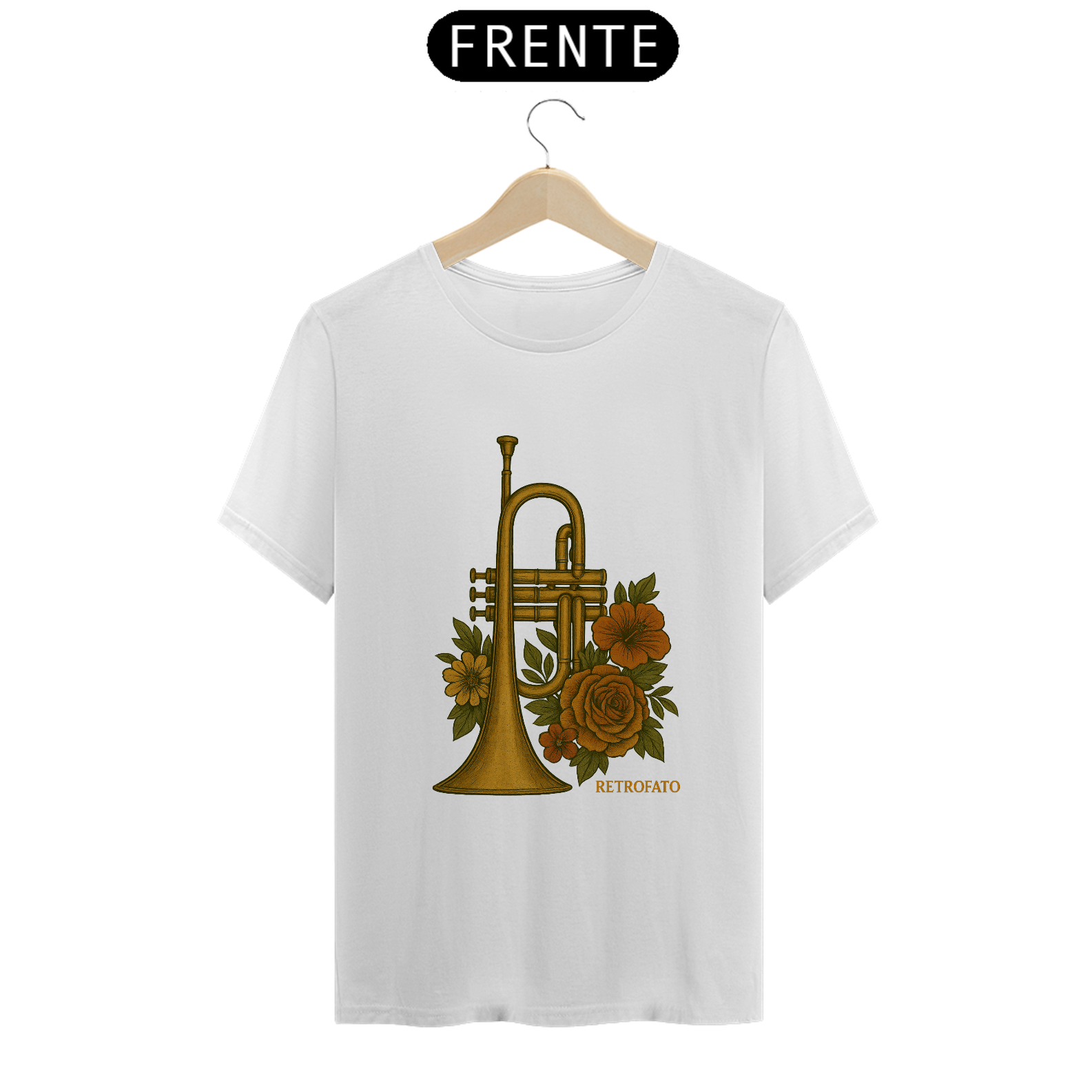 A nossa camiseta exclusiva "Trompa RetroFato" traz uma ilustração autoral de uma trompa, envolta em flores vintage, numa composição cheia de atitude e sofisticação.